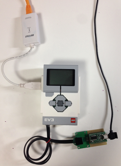 EV3のInputポート1からコンソールアダプターに接続します。次に、コンソールアダプターからUSBケーブルでPCに接続します。