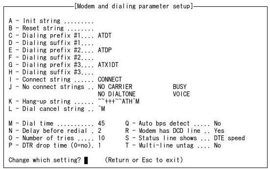 (4)A-Init String(初期化文字列)、 B-Reset String(リセット文字列)、 K-Hang-up string (ハングアップ文字列) の値は削除してください。