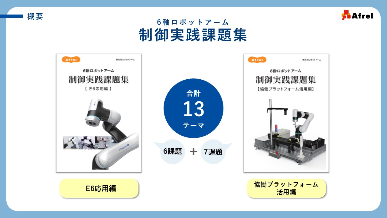 「制御実践課題」とは、E6を活用したロボット演習型の課題です。ロボットアーム制御に必要な思考力と設計力を、実践的な課題を通して学べる内容になっています。目的に応じて取り組めるようE6用編と協働プラットフォーム活用編という二種類のテキストをご用意しています。