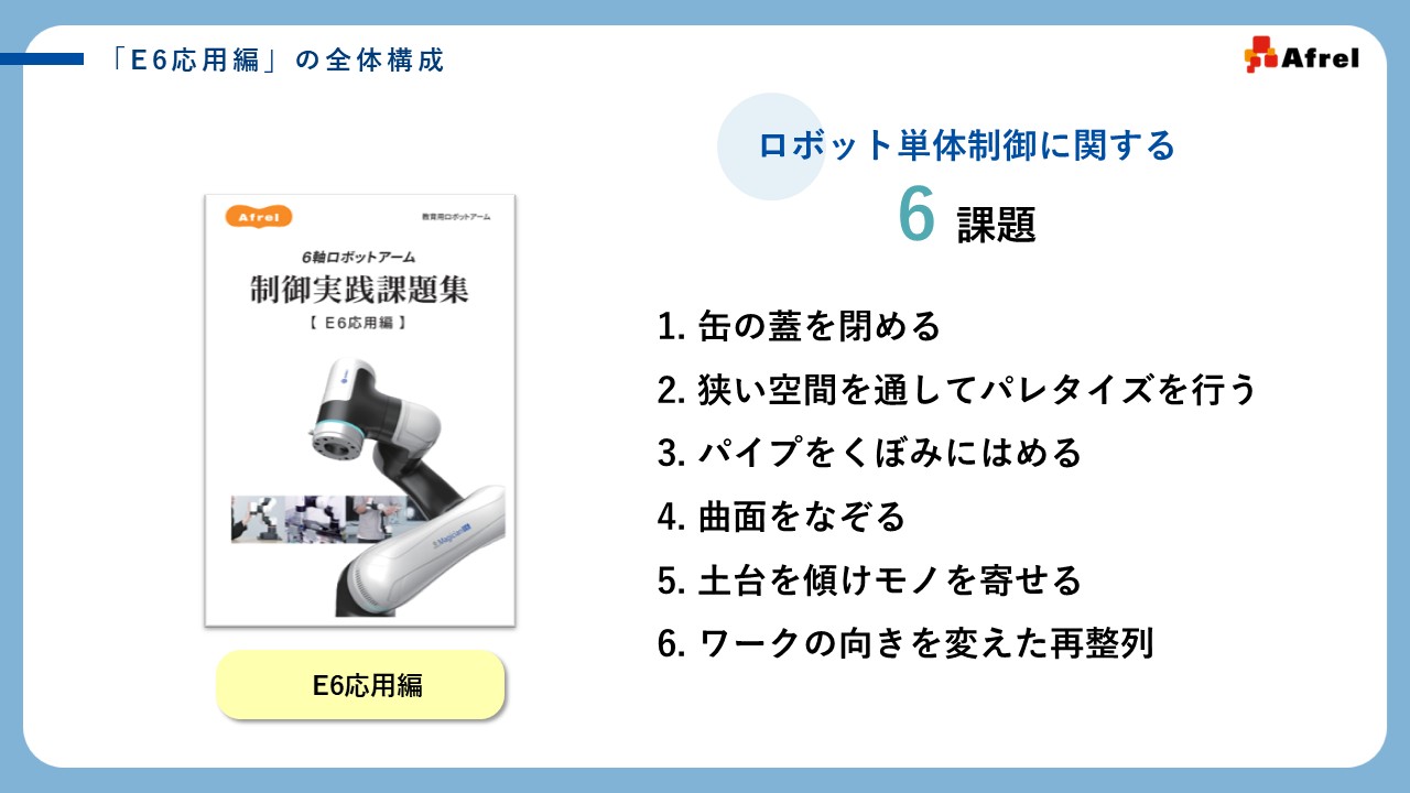 こちらには、「缶の蓋を閉める」、「曲面をなぞる」などの全6つの課題が収録されています。すべてE6本体の操作をメインとした課題で、「ロボット単体の操作や設計スキルを深めること」に特化しています。例えば、「この向きで物を掴みたい」や、「このルートで障害物との干渉を避けたい」といった動作のイメージをゴールにして、姿勢や経路など速度など様々な要素を考慮しながら試行錯誤を重ねていく内容となっています。
