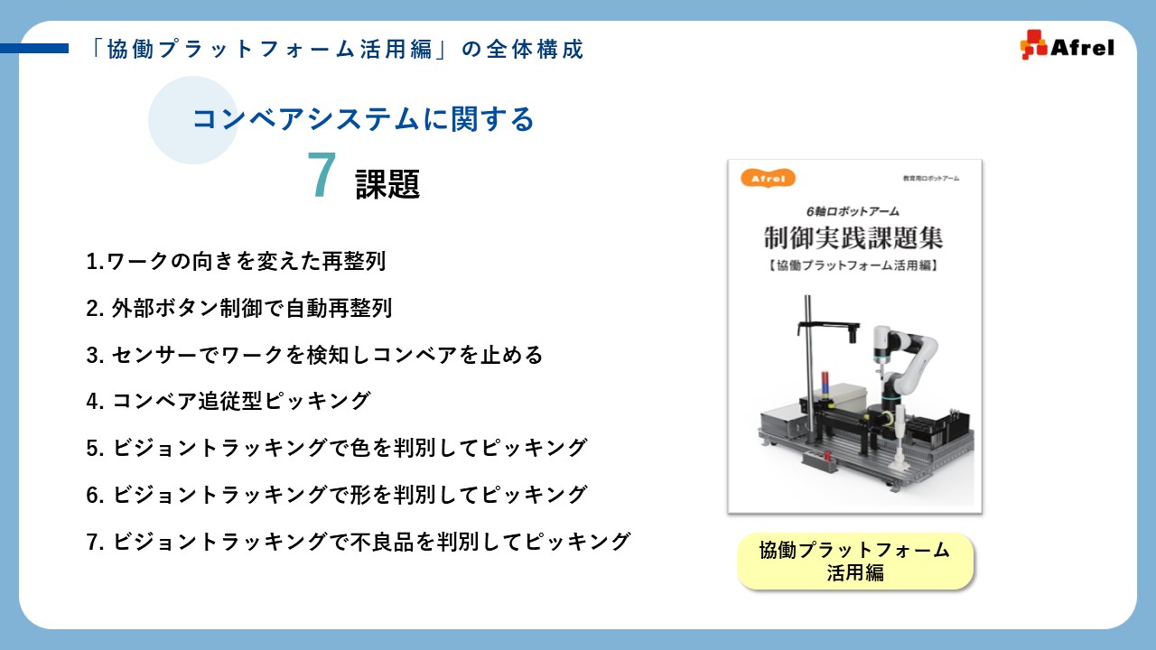 協働プラットフォーム活用編には、「センサーでワークを検知しコンベアを止める」や、「ビジョントラッキングで色を判別してピッキング」など全部で7つの課題が収録されています。これらは全て協働プラフォームという専用のキットを使用した課題です。