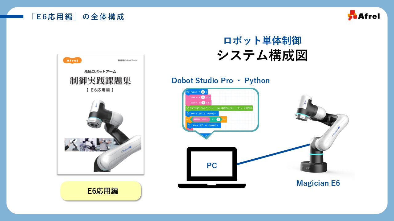 使用する機材はパソコンとE6本体のみで それをランケーブル1本で接続することができます。専用の「Dobot Studio Pro」または Python環境を使用することができるので、用途に応じてプログラミング言語を選ぶことができます。その一方で構成自体はとてもシンプルなので、ロボットの動きそのものに集中することができます。ただプログラムを組むだけで終わらず、動作を設計するという視点を育てる、それがE6応用編の大きな特徴です。