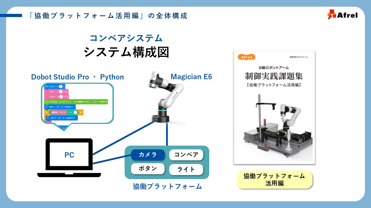 協働プラットフォーム活用編では、外部機器と連携するシステム全体の設計を学ぶことができます。協働プラットフォーム(正式名称は、「協働ロボットユニバーサルトレーニングプラットフォーム」)とは、センサー、コンベア、ビジョンカメラといった周辺機器を組み合わせることで、工場の自動搬送ラインのような一連のプロセスを実践的に学べる実習キットです。