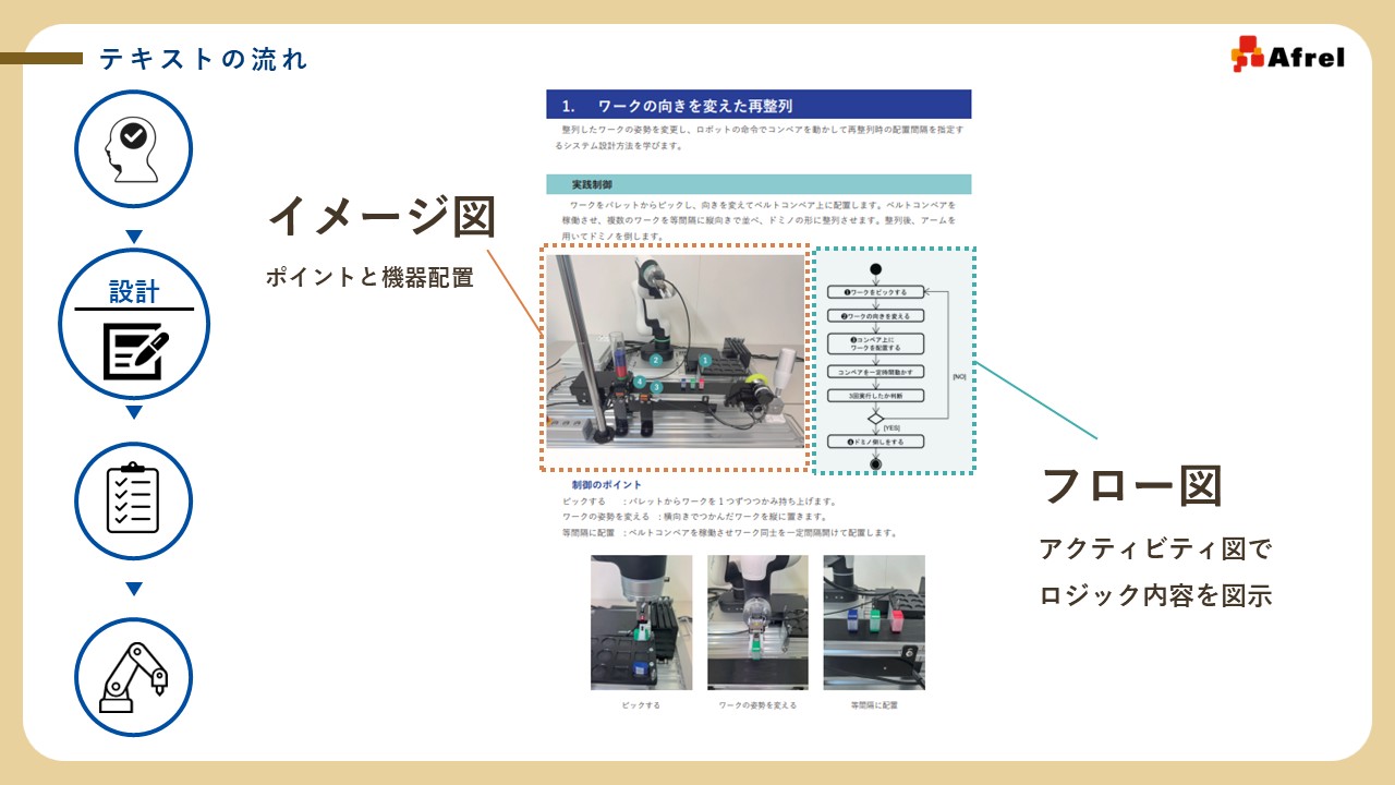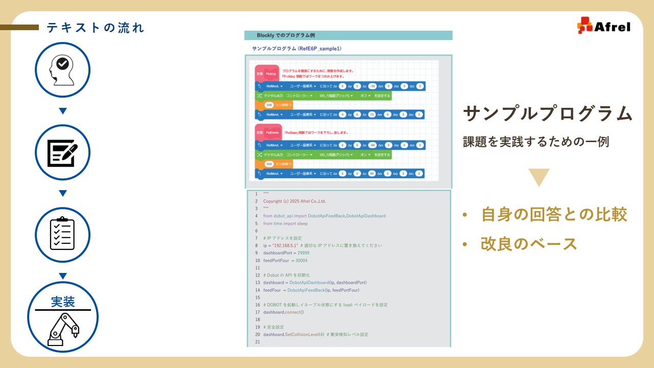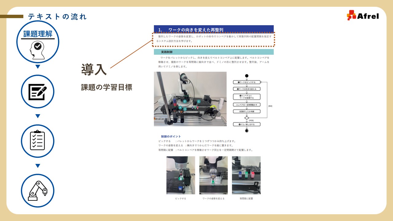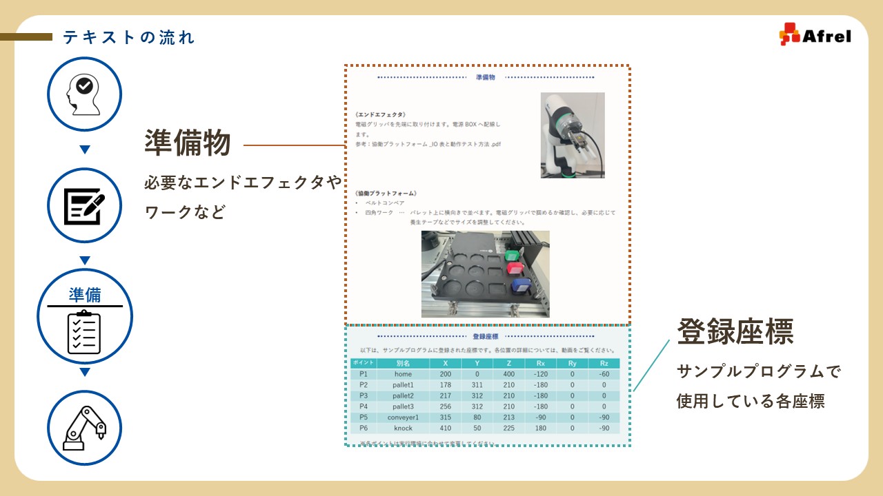 準備物欄には、その課題に必要なエンドエフェクターやワーク類が一覧で整理されていて、授業前に段取りを確認する上で役立ちます。この欄を見ながら必要な準備を整えれば、すぐに実機での動作に取りかかることができます。