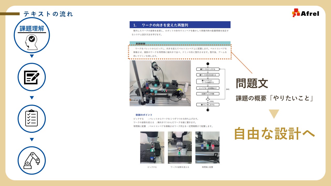 こういった特徴を持つロボットを採用することで、学習者一人あたりの実習時間を増やすことが可能です。そして、沢山の時間ロボットを動かせる分、実習の課題がより重要になります。