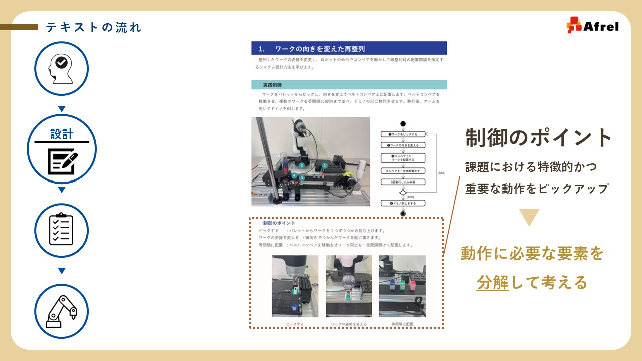 制御のポイントでは、各課題の中でも特に意識して取り組んで欲しい動作や構成要素をピックアップしています。例えば6軸ロボットならではの姿勢制御や、外部機器との連携動作など、実際の実行時に重要になる項目を取り上げています。もし一連の処理を最初から自分でやるのは難しいという場合でも、この制御のポイントを1つずつ参考にすれば、必要な動きを分解しながら再現していくことが可能です。基本的な動作に分解されることで、一見複雑そうに見える動きも実はシンプルな要素の組み合わせだという感覚が自然と身についていきます。