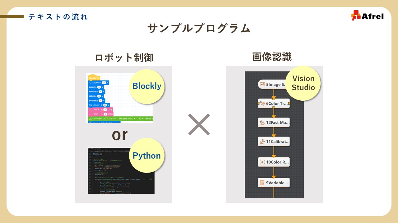各課題には、BlocklyとPythonそれぞれの言語でサンプルプログラムを用意しています。学習者の学習レベルや授業の目的に応じて、どちらか使いやすい方を選んでいただけます。更に画像認識を扱う課題では、これらのサンプルプログラムに加えてVisionStudioという専用ソフトウェアも使用します。