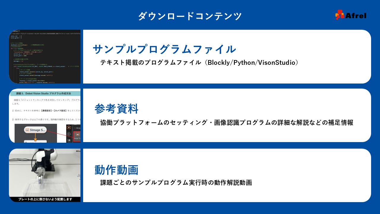 また、組み立て・外部機器のI/O確認といった授業前のセッティング作業についても、DLC内の「参考資料」にて詳しい手順をご紹介しています。協働プラットフォームの設置方法や画像認識のプログラム解説など、 必要な情報がそろっていますのでスムーズに準備を進めていただけます。