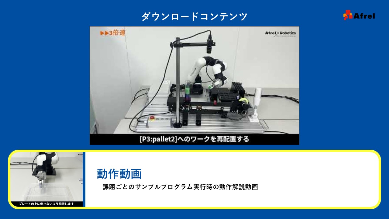 「動作動画」では、各課題のサンプルプログラムを実行した実際の映像をご覧いただけます。複雑な動きも直感的に確認することができるので、例えばどのタイミングで姿勢が切り替わったのか、外部機器との連携でどのような感じで動作が変化したのか、といった細かな動きの流れも、映像を通してしっかりと把握できるようになっています。