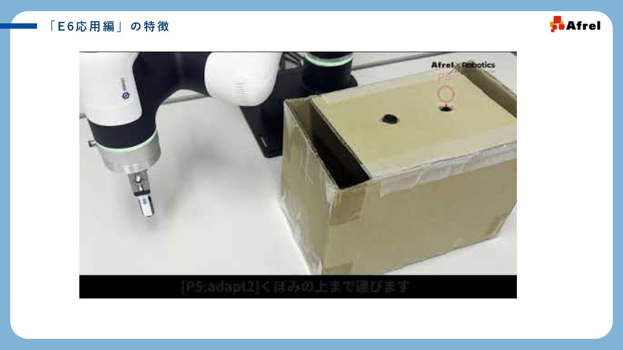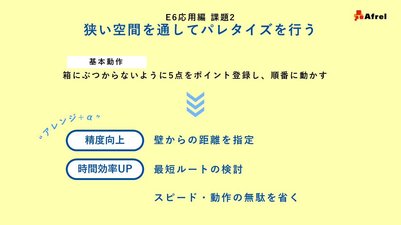 こちらはE6応用編「課題2:狭い空間を通してのパレタイズ」です。この課題ではサンプルプログラムとして「箱にぶつからないように5点をポイント登録し、順番に動作させる」という動きを用意していますが、この基本動作に対して、例えば、「壁からの距離を一定以上に保つ」という制約条件を加えたり、最短ルートを検討したり、スピードや加速度を調整して、動作の時間効率を高めるといったアレンジを加えることで、「精度の向上」「経路最適化」など、より現場的な視点での課題設計が可能になります。