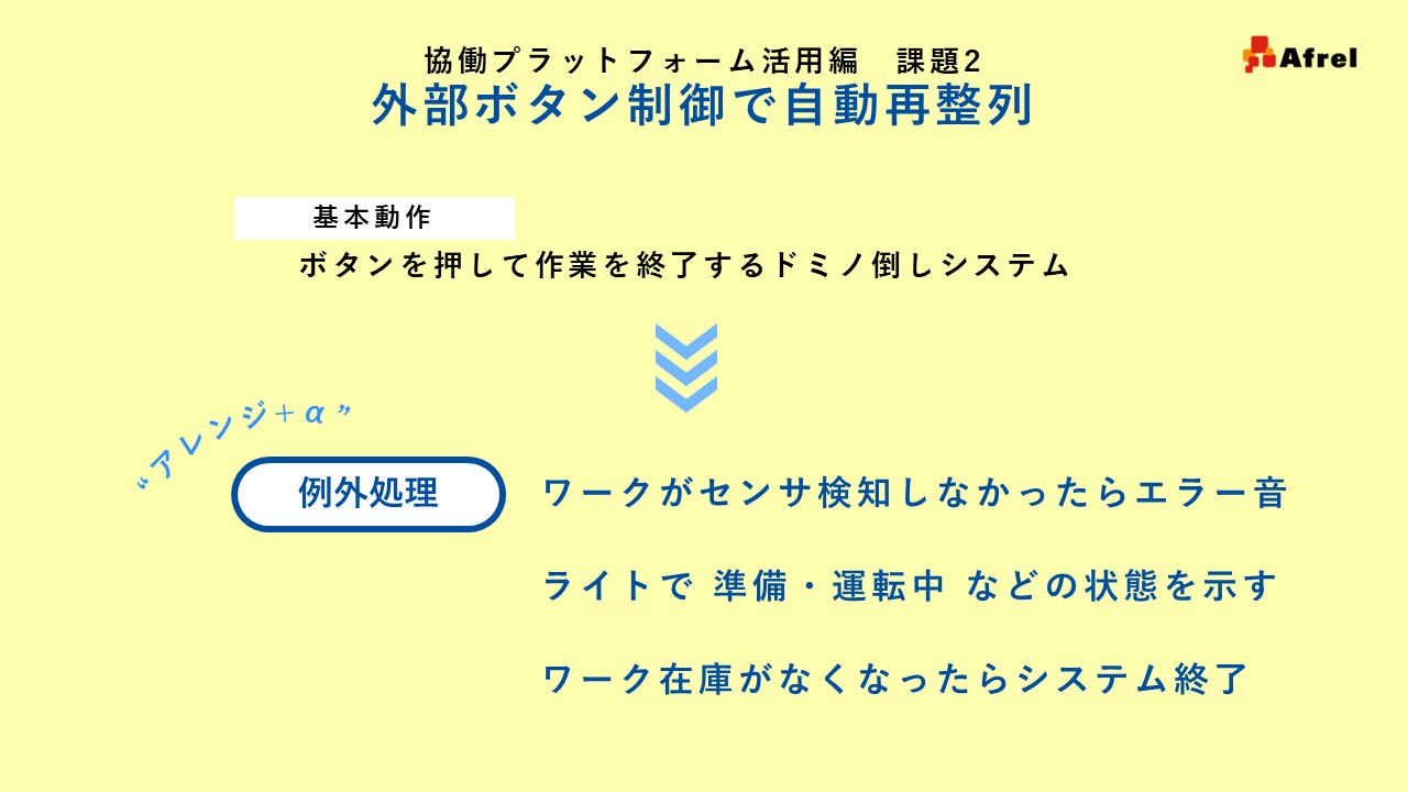 2つ目のアレンジ例は、「協働プラットフォーム活用編:課題2(外部ボタン制御での自動再整列)」です。この課題は、「スタートボタンで動きだし、ストップボタンで止まるドミノ倒しプログラム」がベースになっています。ここに現場を想定した例外処理や状態管理の仕組みを加えていくと、より高度な“状態制御ロジック”に発展させることができます。
