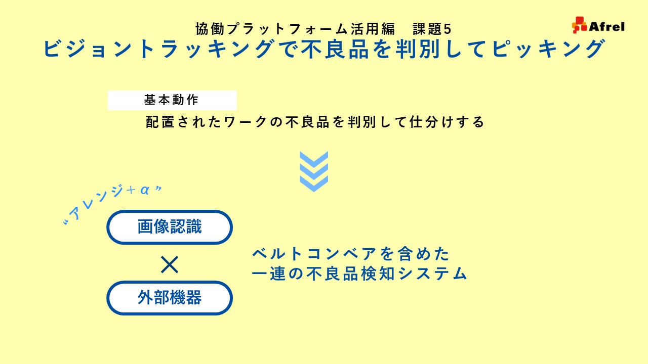 3つ目のアレンジ例は、「協働プラットフォーム活用編:課題5(ビジョントラッキングによる不良品検知)」です。この課題は「配置されたワークに対して画像認識を用い、不良品を判別・仕分けすること」が基本になっています。ここに「ベルトコンベアで流れてくるワーク」に対して画像処理を行うシステムのアレンジを加えることで、ビジョン検査から仕分けまでを流れとしてつなげた、「動的な製品検査システム」として構築することができます。コンベアと組み合わせることで、ワークの動きにタイミングを正確に合わせる制御設計が必要になるため、トラッキング精度や同期処理の工夫といった課題へとステップアップできます。