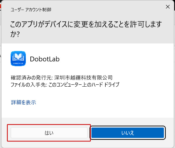 ※この表示が出ない場合は、DobotLabのインストールは完了になります。