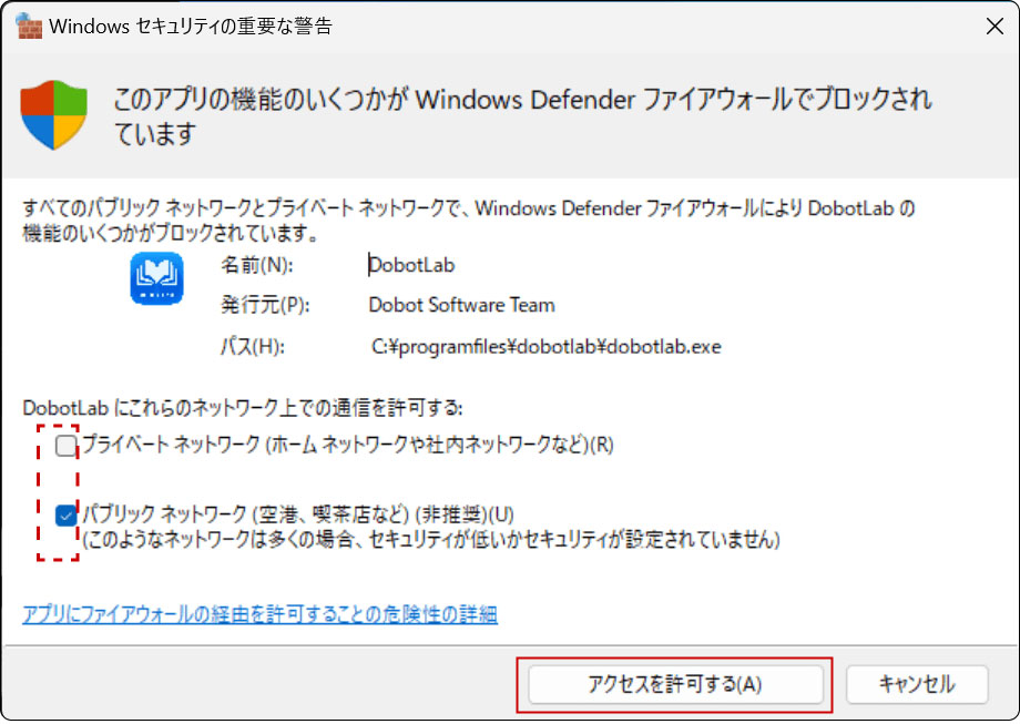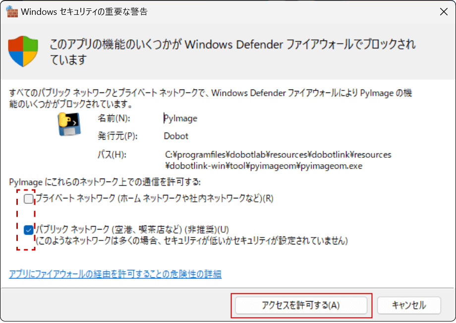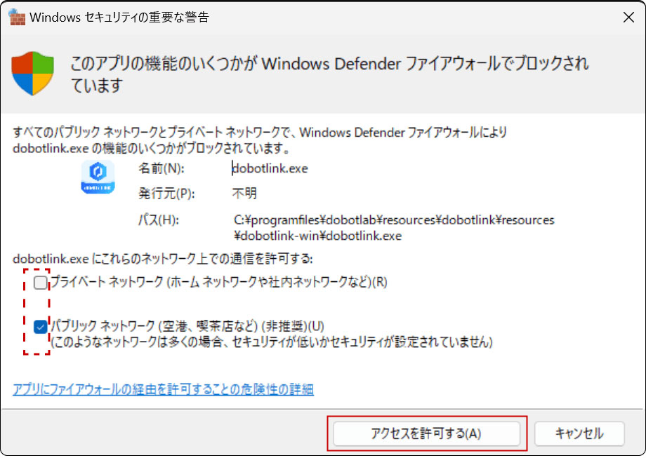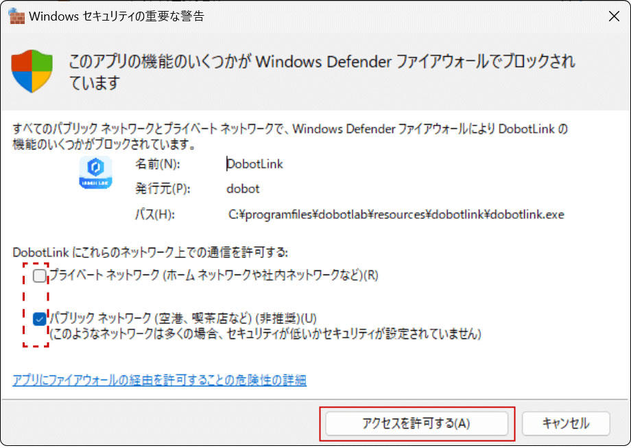 - セキュリティの重要な警告が4つでますので、任意の設定をチェックし、「アクセスを許可する(A)」をクリックします。