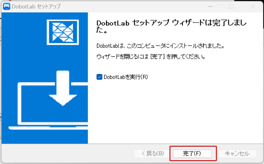 インストールが完了するとこのような画面になります。「完了」をクリックします。 ※「DobotLabを実行(R)」にチェックを入れたままにしてください