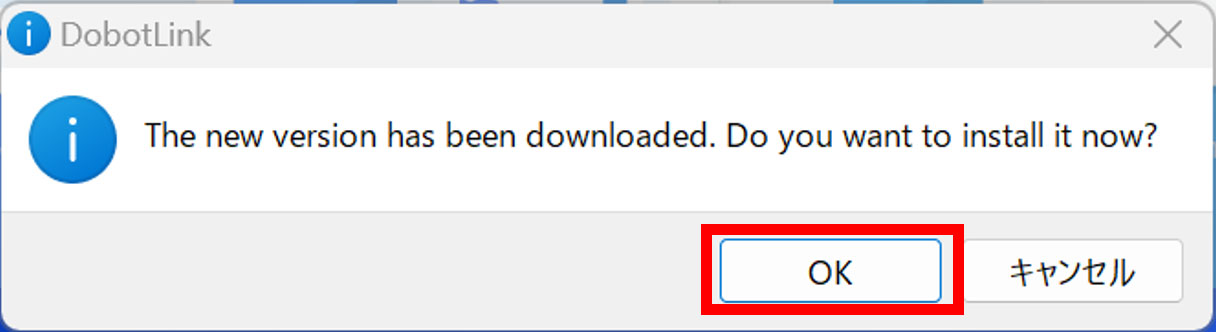 - この画面がでたら「OK」をクリックしてください。PCとDOBOTを接続用ソフトをインストールします。
