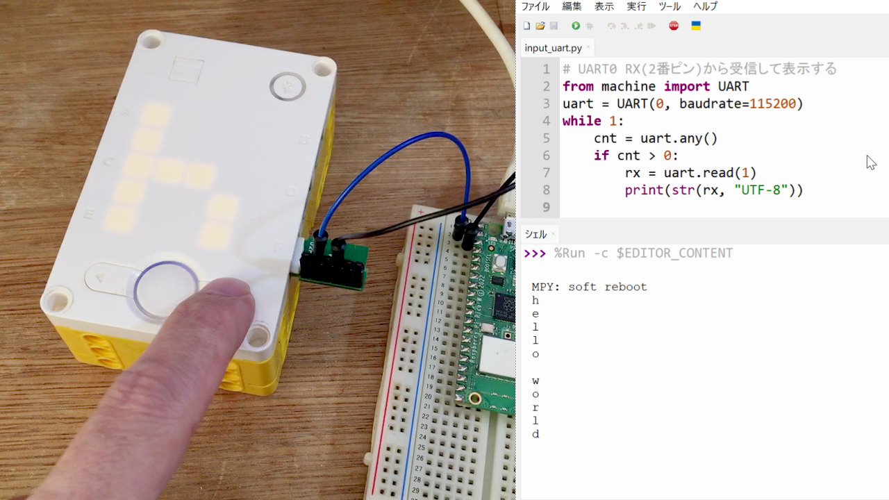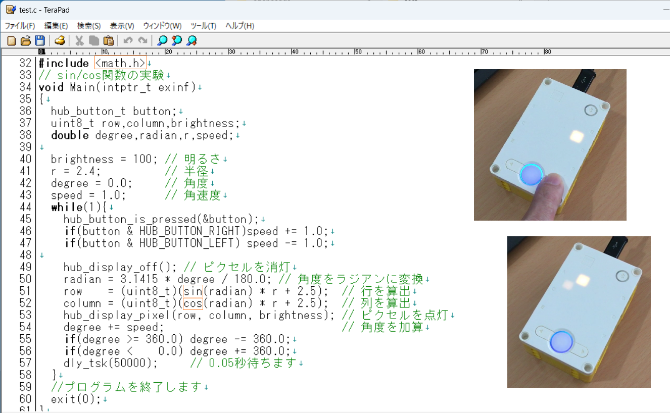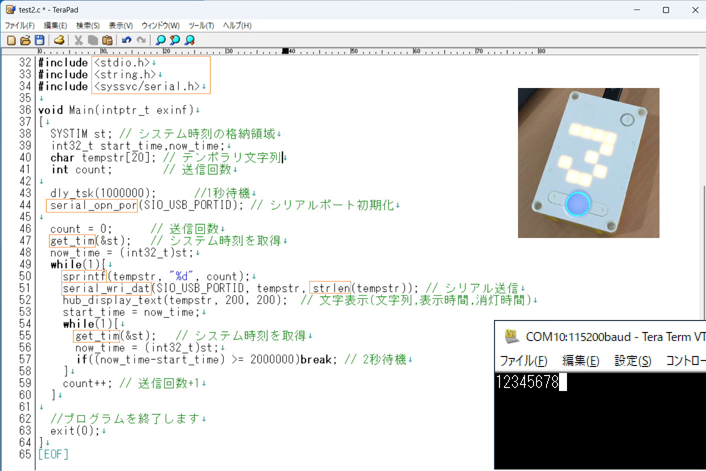 プログラムを実行すると、2秒間隔でライトマトリクスにループ回数を表示します。ループ回数は文字列化してから表示しています。表示している文字はUSBポートに送信します。ターミナルソフトの「Tera Term」で文字列を受信することができます。