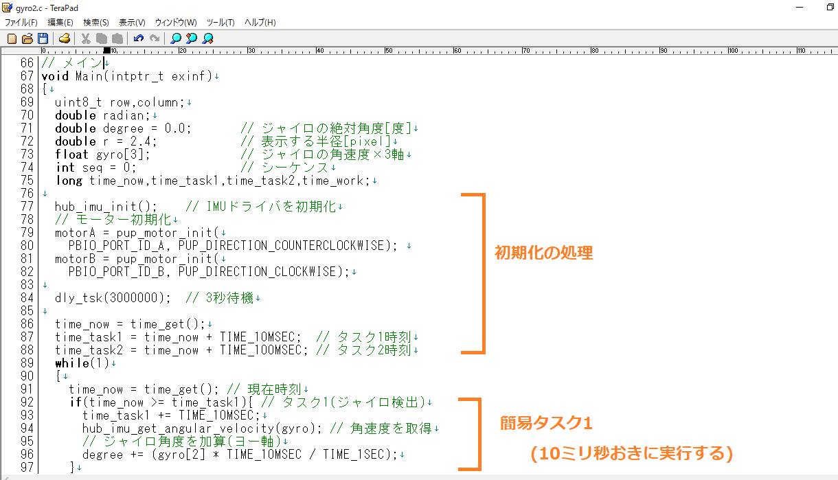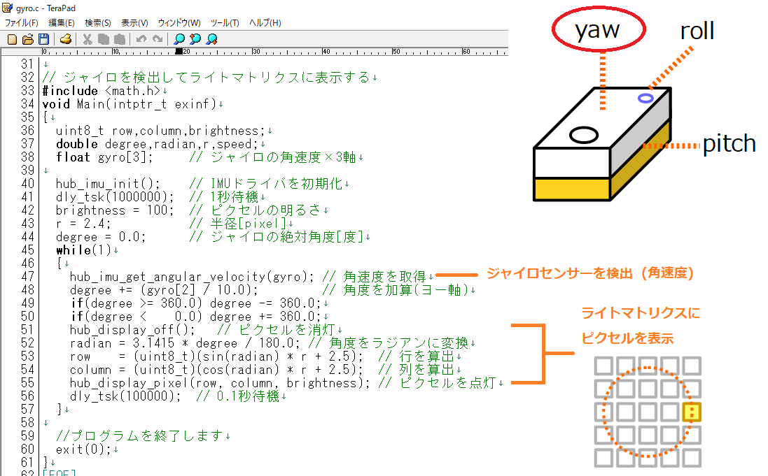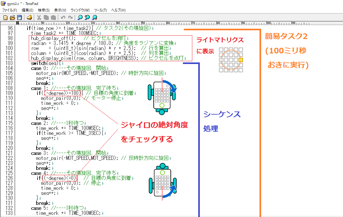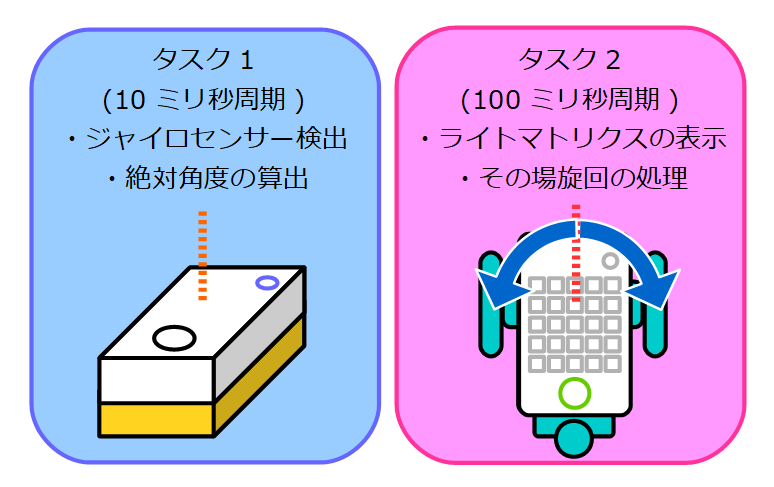 ここでマルチタスクの機能が必要となります。ジャイロセンサーの角速度を加算する処理(タスク1)とライトマトリクスの表示とその場旋回をする処理(タスク2)、この2つを並列的に行わないといけません。マルチタスクはリアルタイムOSであるSPIKE-RTの得意分野です。