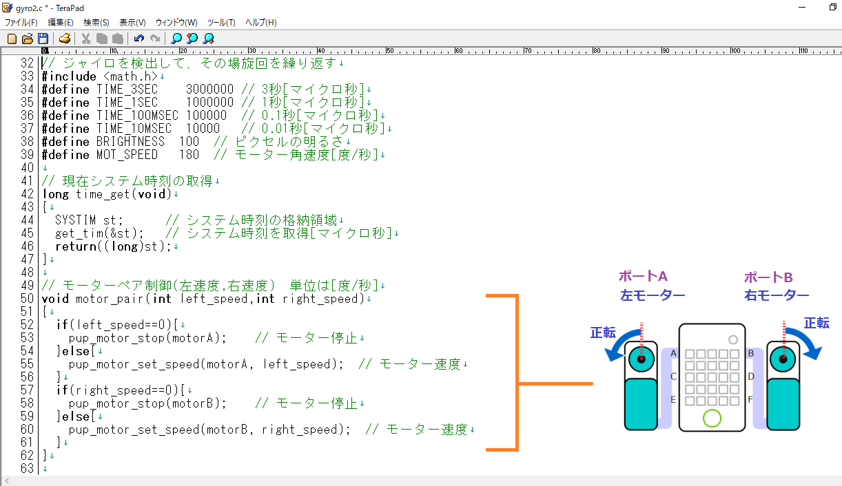 ジャイロセンサーで絶対的な角度を検出することに成功したので、それに連動してロボットがその場旋回を繰り返すプログラムを作ります。